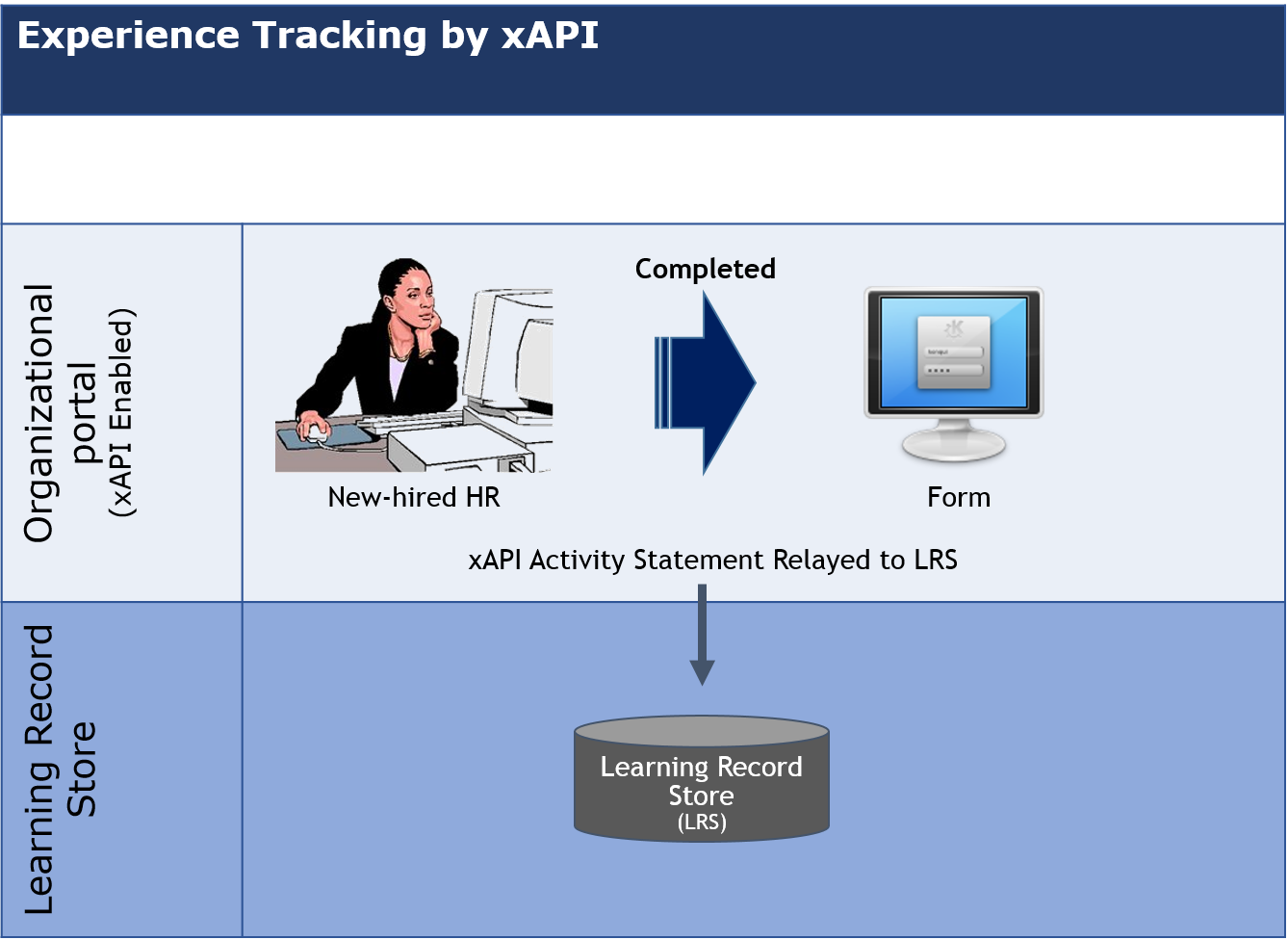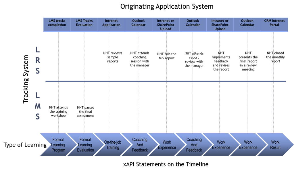 Let us take the earlier example of a new-hired HR trainee who is learning to manage the attendance reports. The formal learning schedule is recorded by an LMS, and the activities related to work experiences are recorded by an LRS of a xAPI. This can be illustrated as follows: